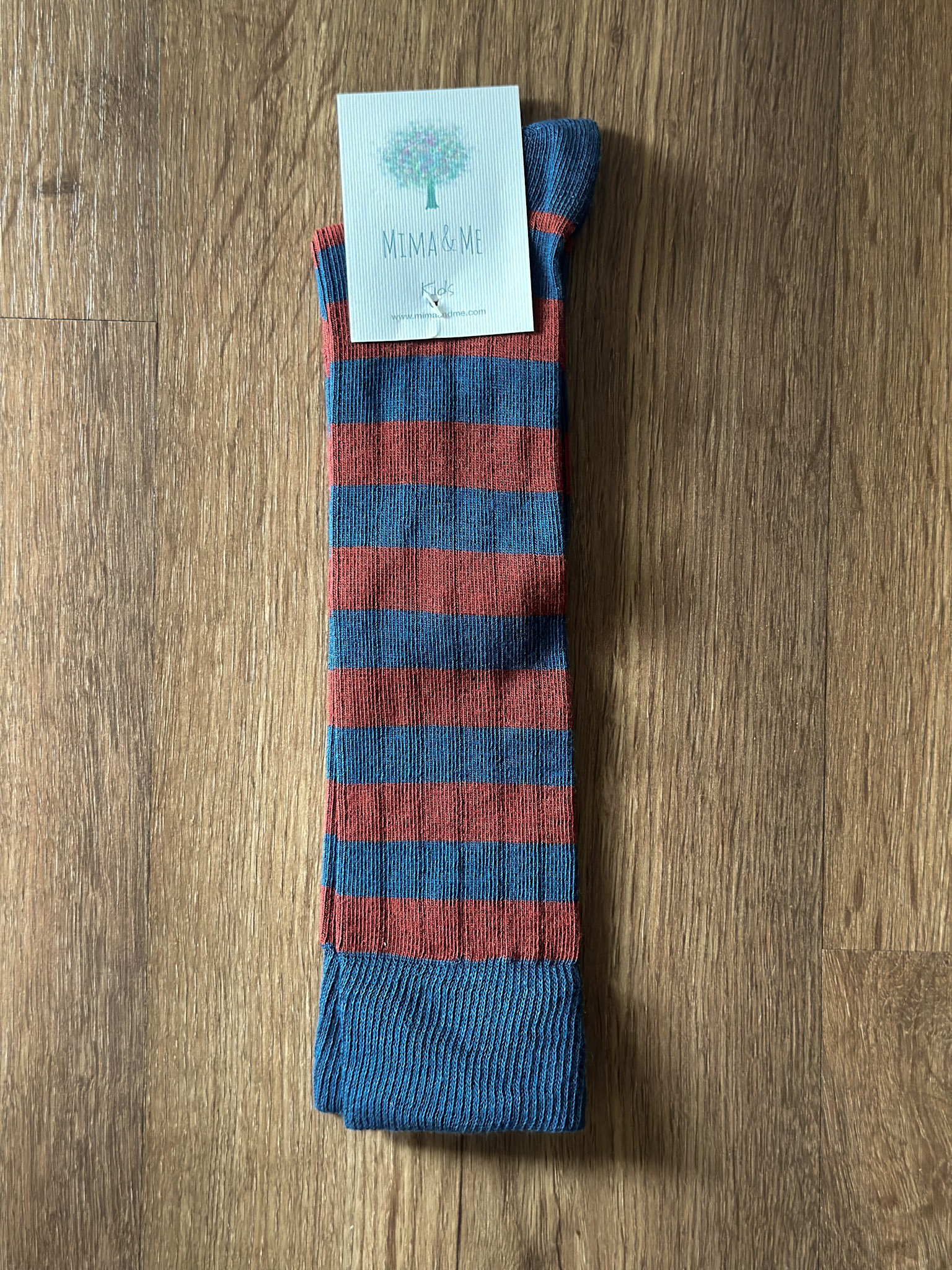 CALCETIN ALTO CON RAYAS AZUL Y TEJA.