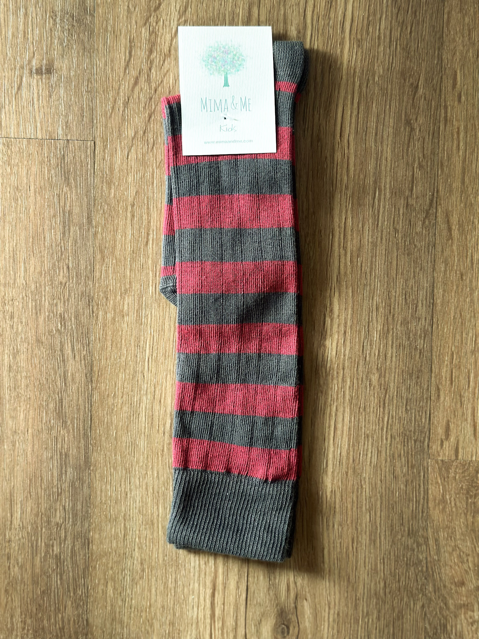 CALCETIN ALTO RAYAS GRIS VERDOSO Y BURDEOS.