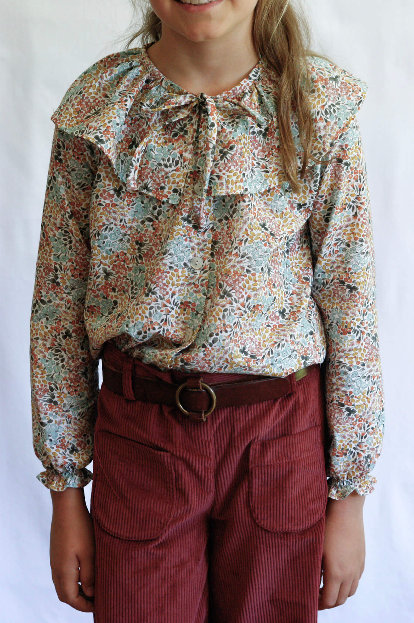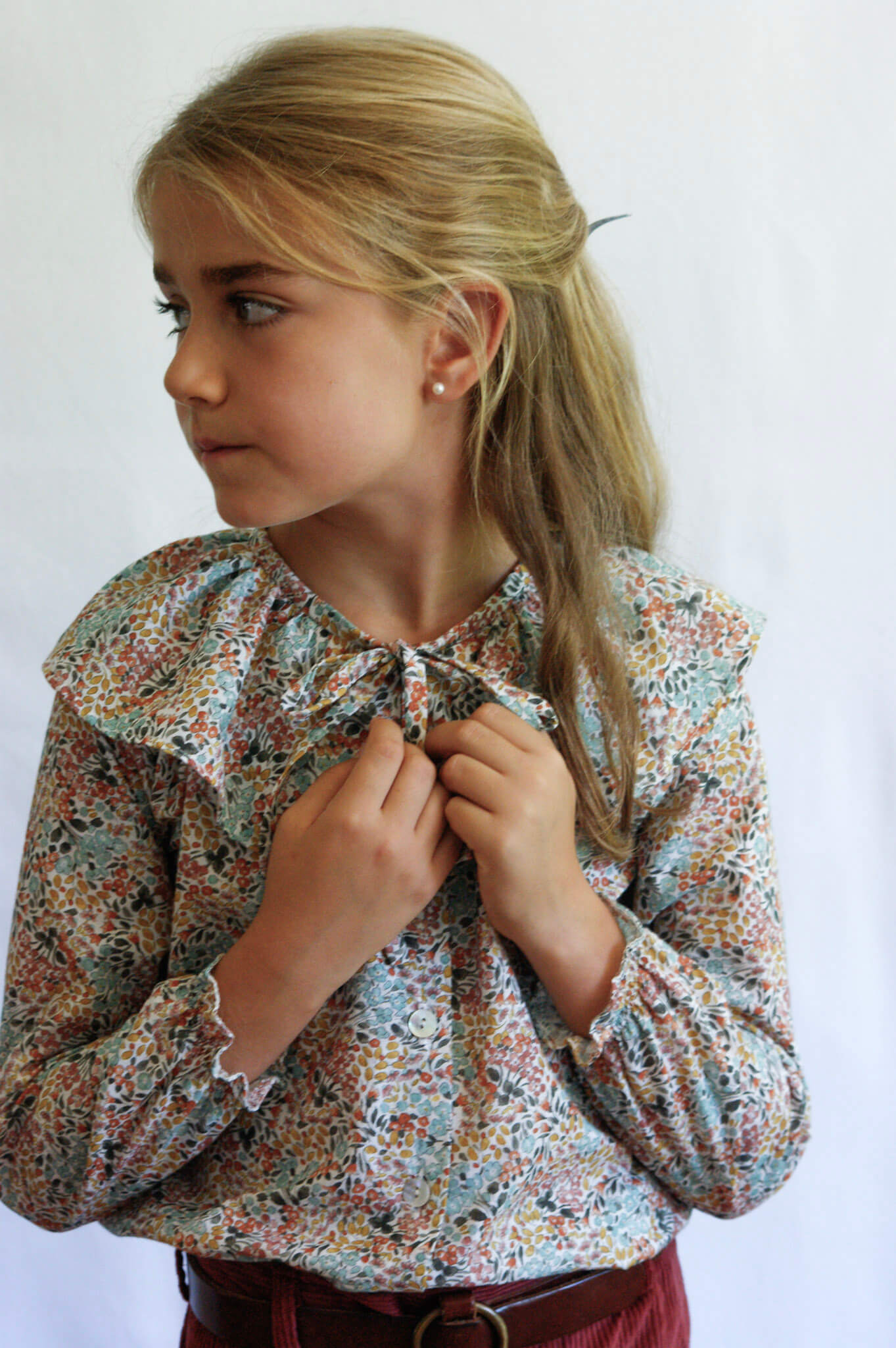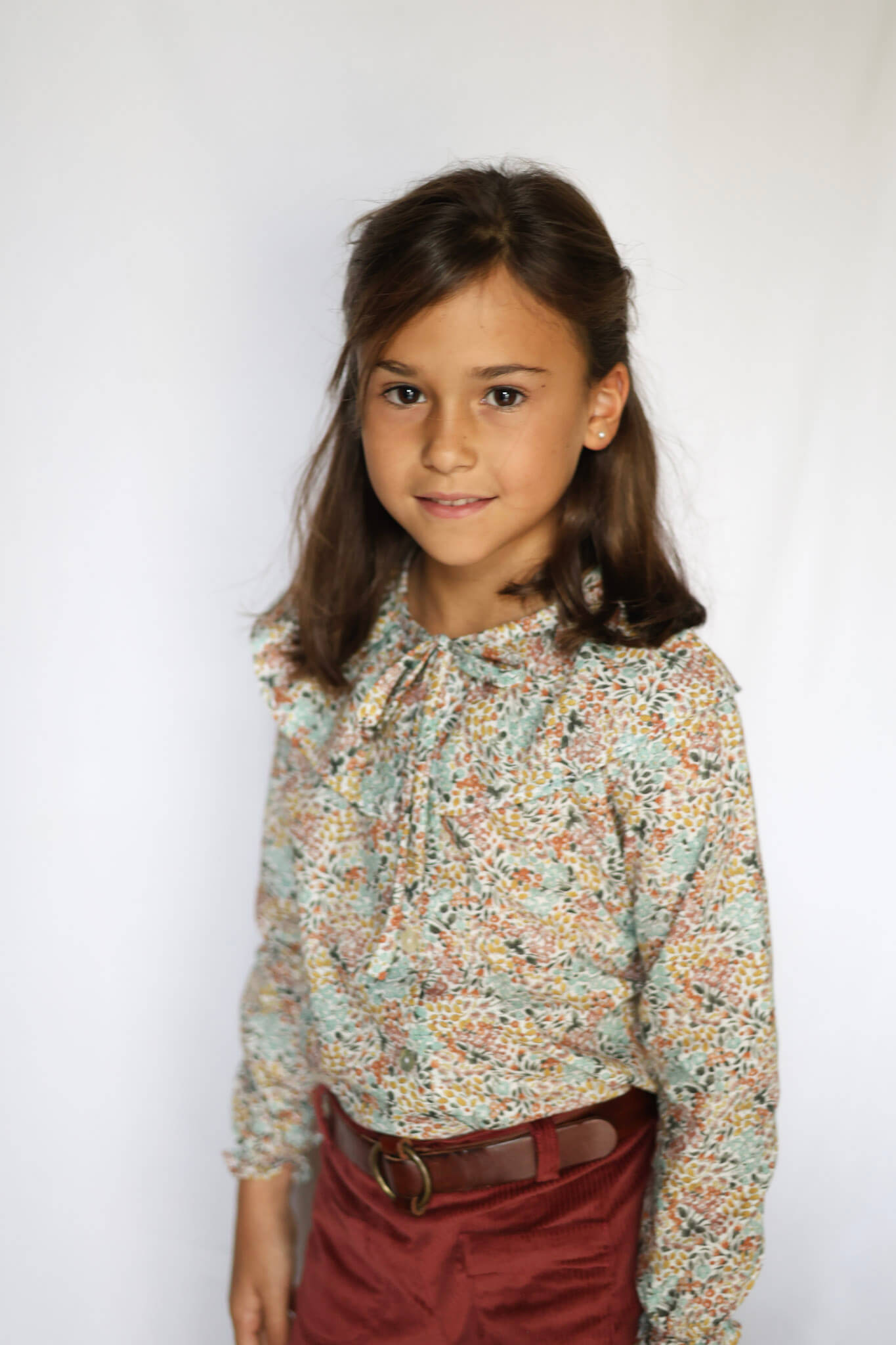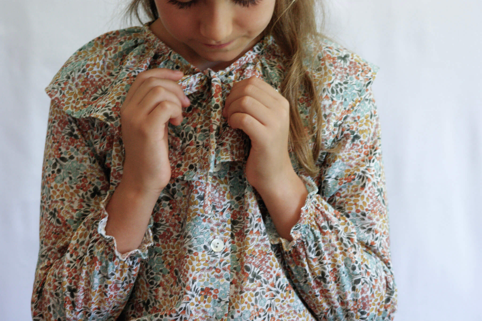 CAMISA DE ALGODÓN ESTAMPADA CON CUELLO VOLANTÓN Y LAZADA.
