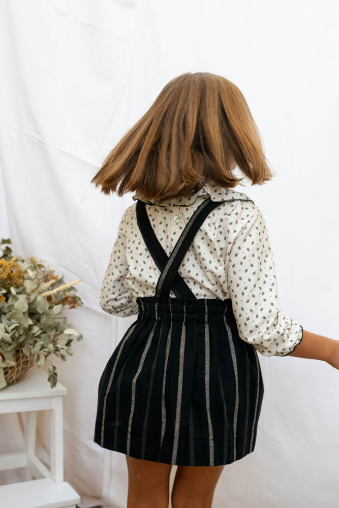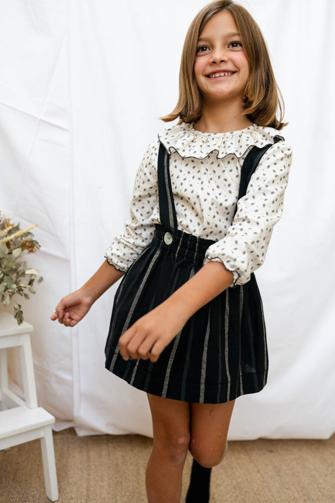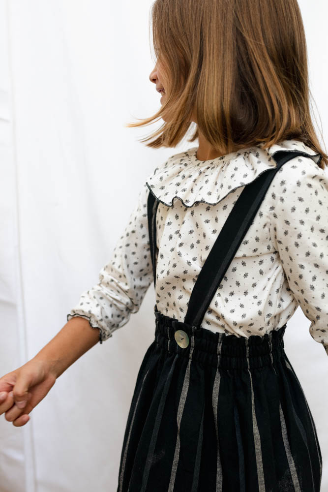 Camisa cuello volantón con fondo claro y estampado color plomo.