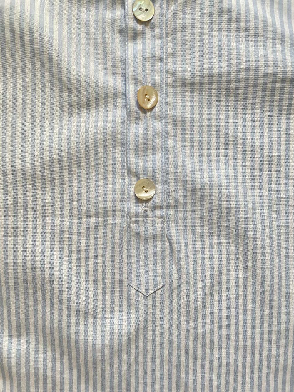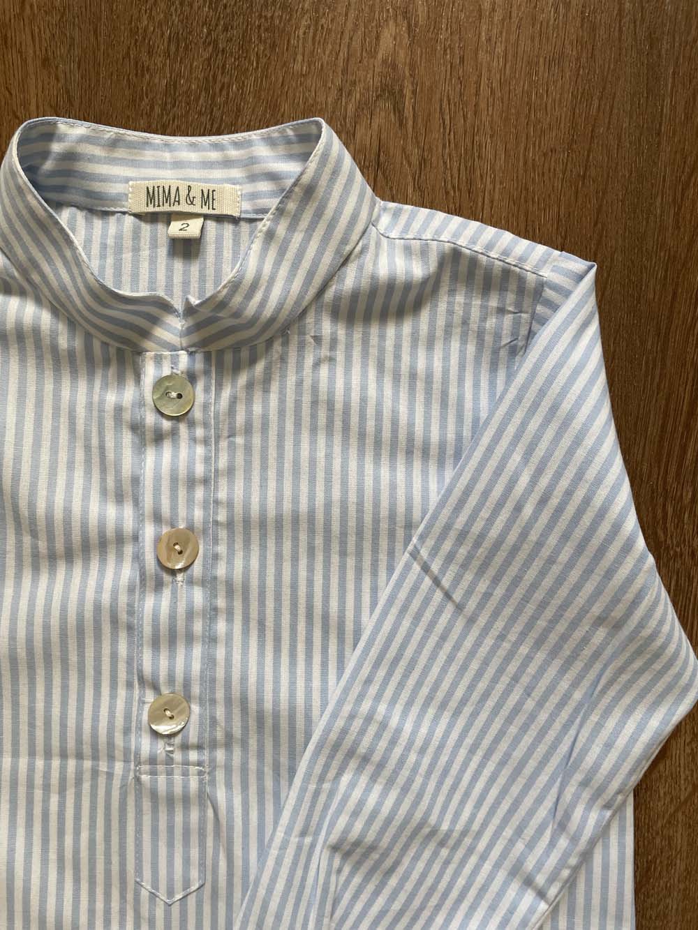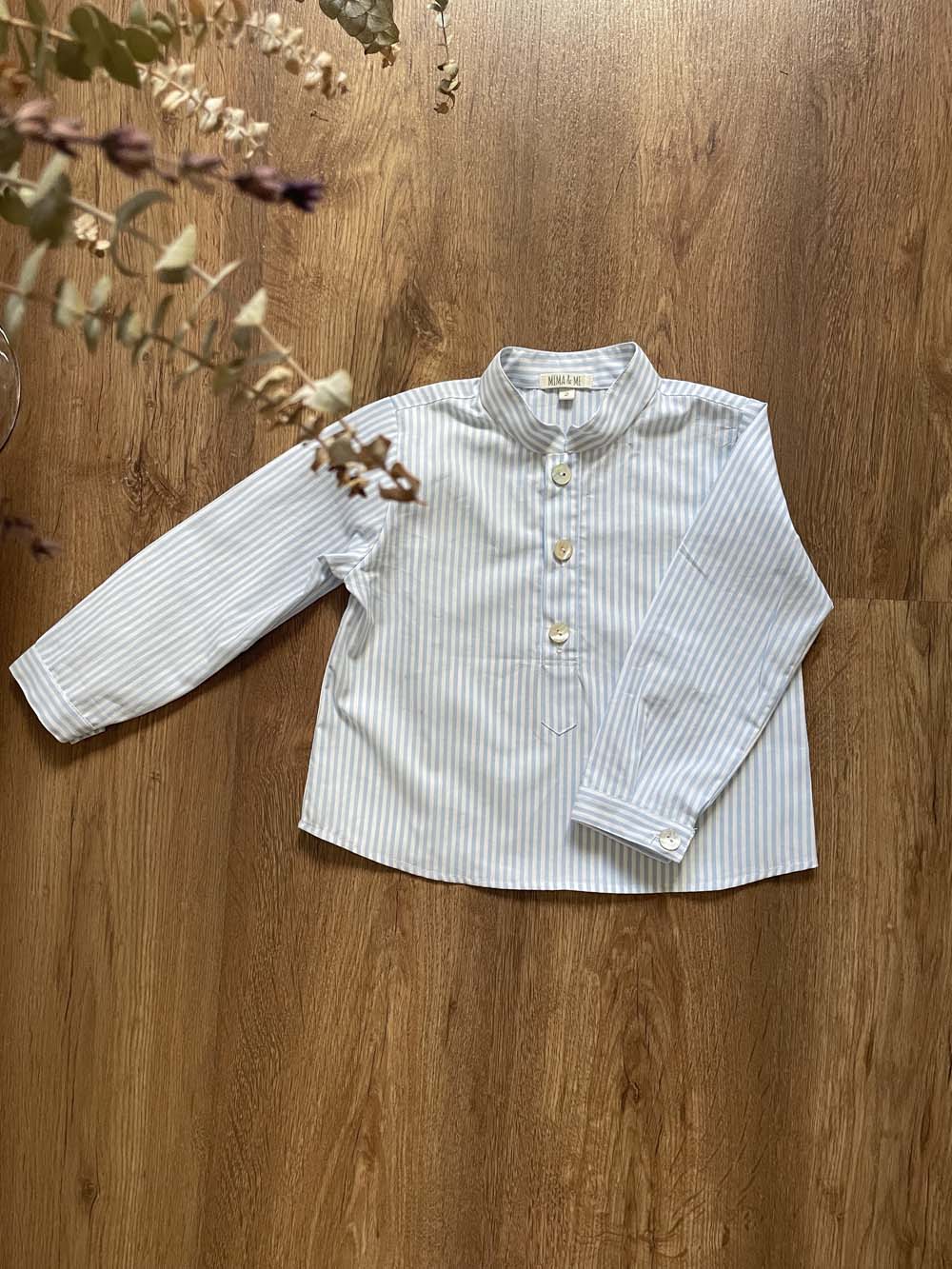 Camisa de cuello mao rayas celeste y blancas.