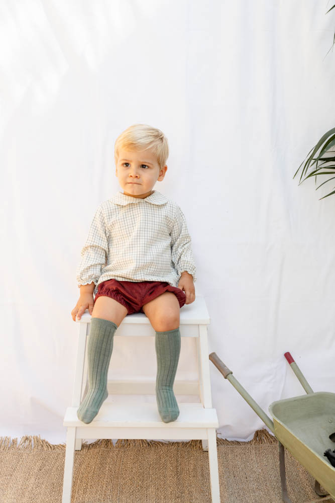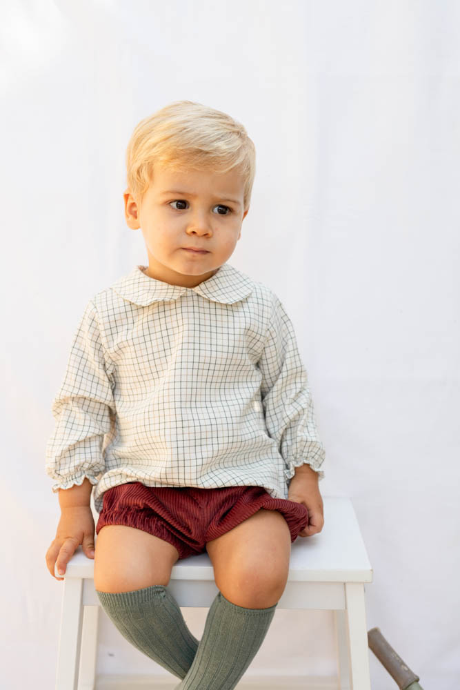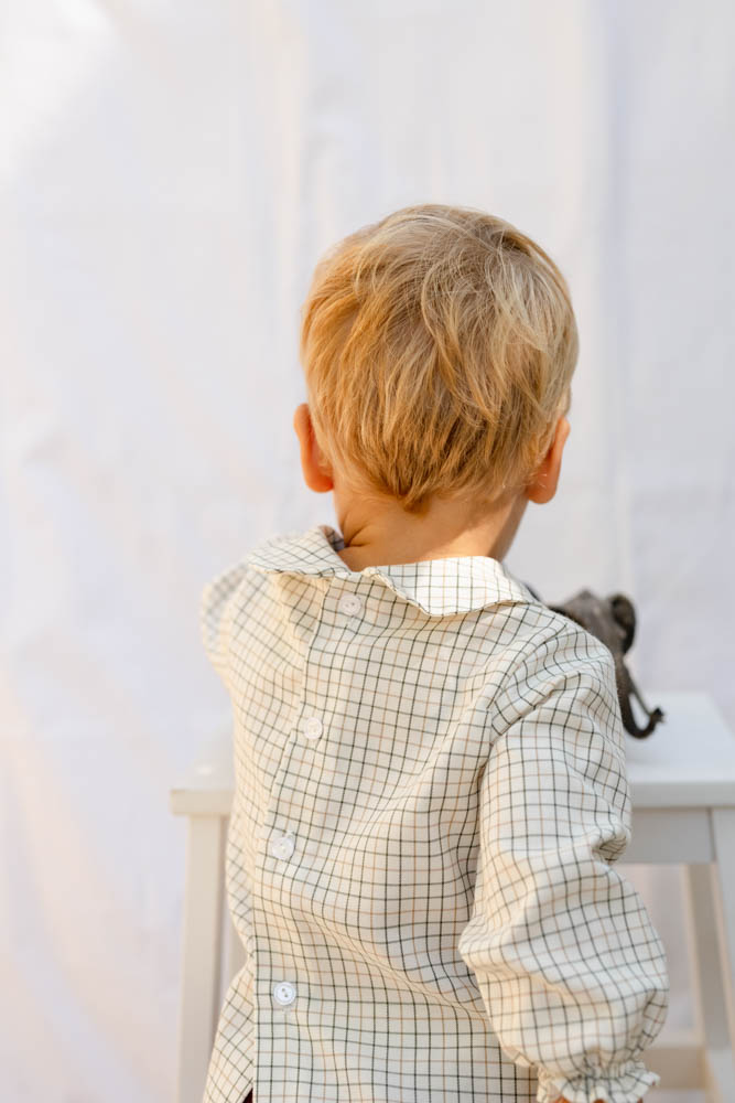 Camisa cuello bebe con tejido de villela estampado de cuadros con fondo claro.