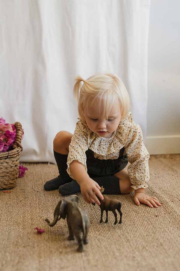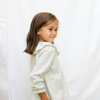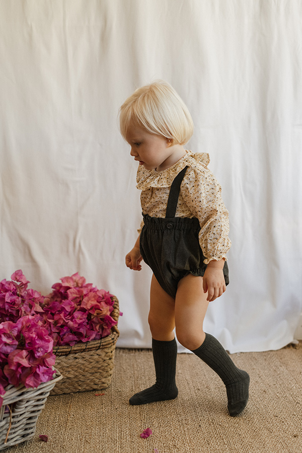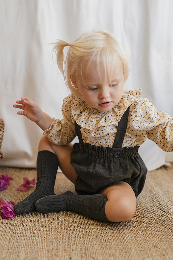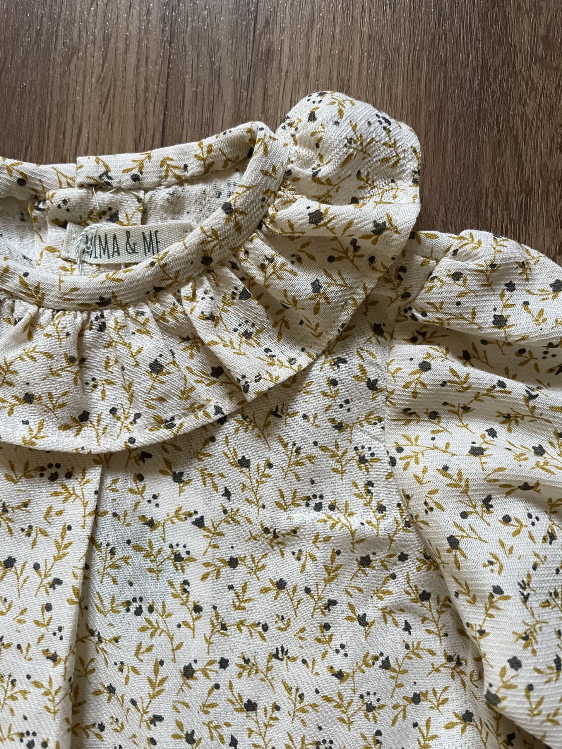 Camisito estampado con florecitas en tonos mostaza y gris antracita. Cuello volante.