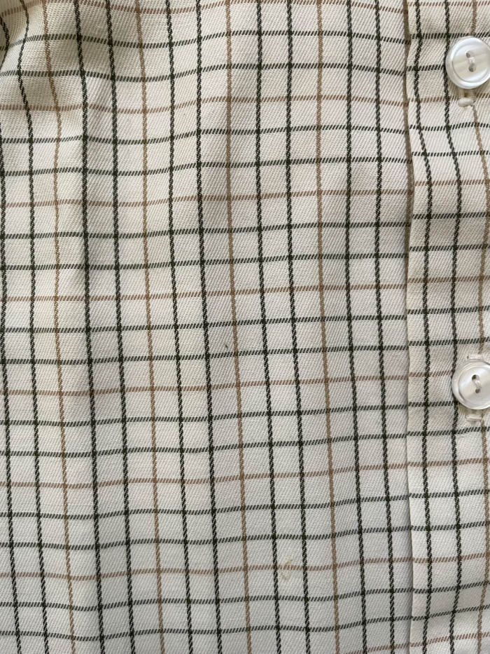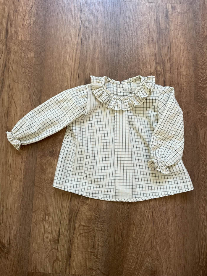 Camisa cuello volantón con tejido de villela estampañado en cuadros con fondo claro.
