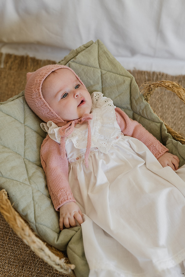 Capota de punto rosa con detalle de ochos. Si no queda la talla que necesitas, escríbenos para encargarlo.