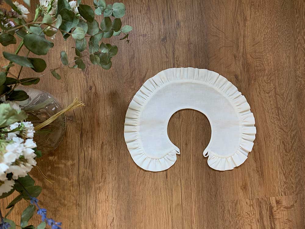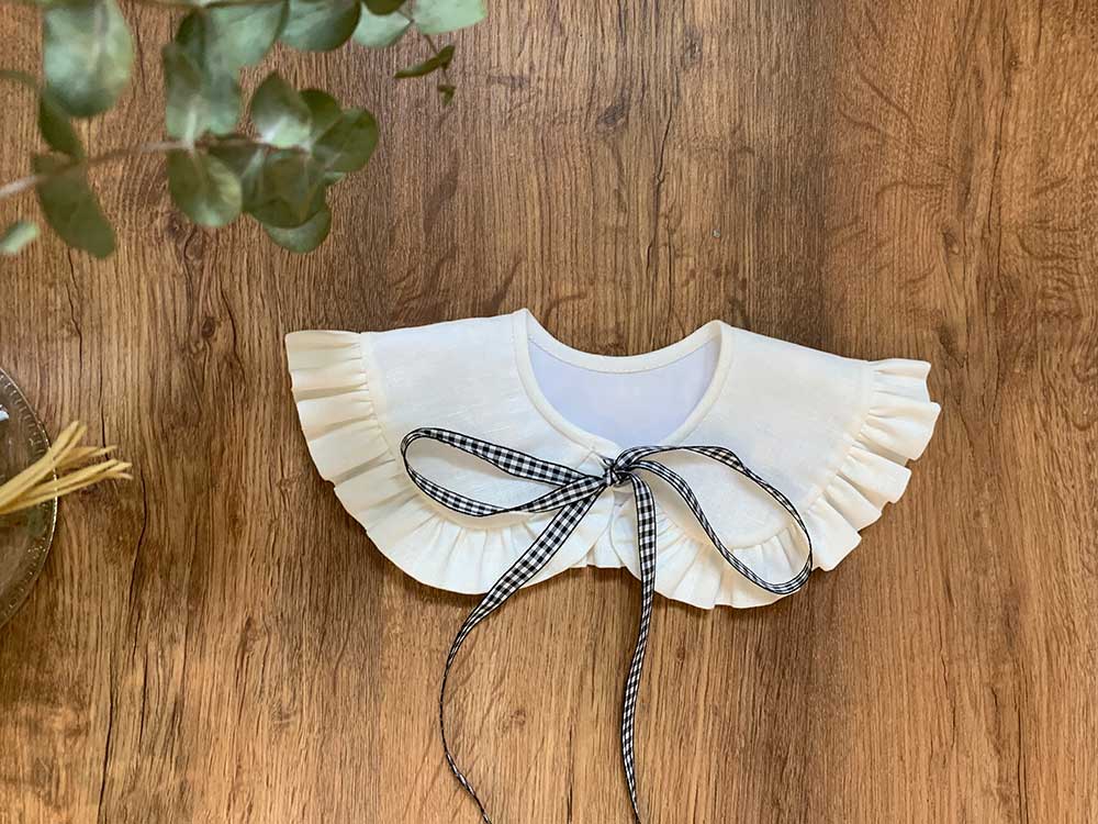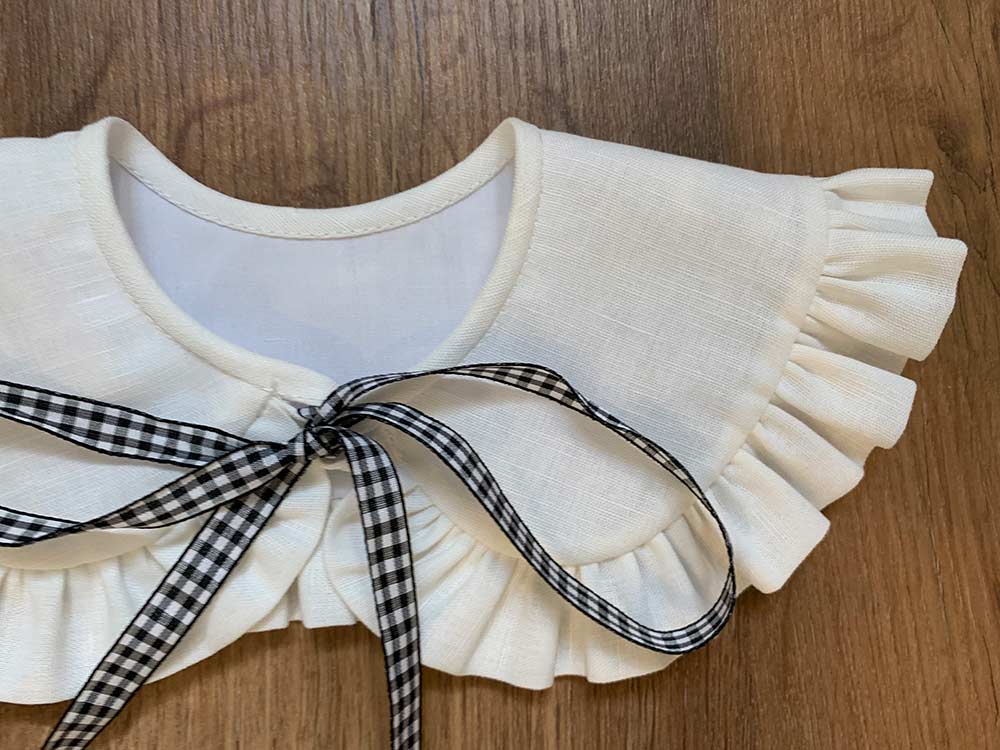 Cuello hecho de lino y lazada (color a elegir según modelo vestido). Este cuello se hace por encargo y solo hay tres medidas P(1-2), M(3-4) y G (5-6)