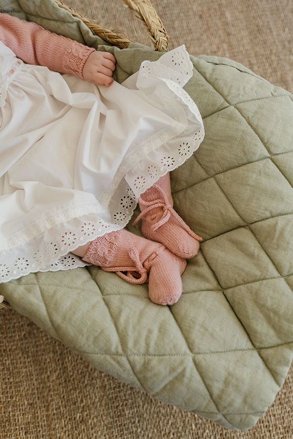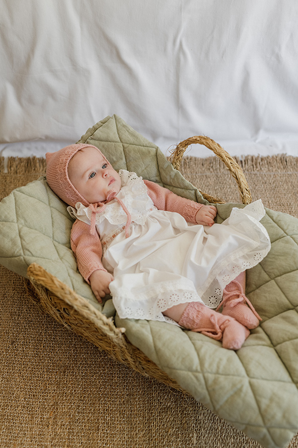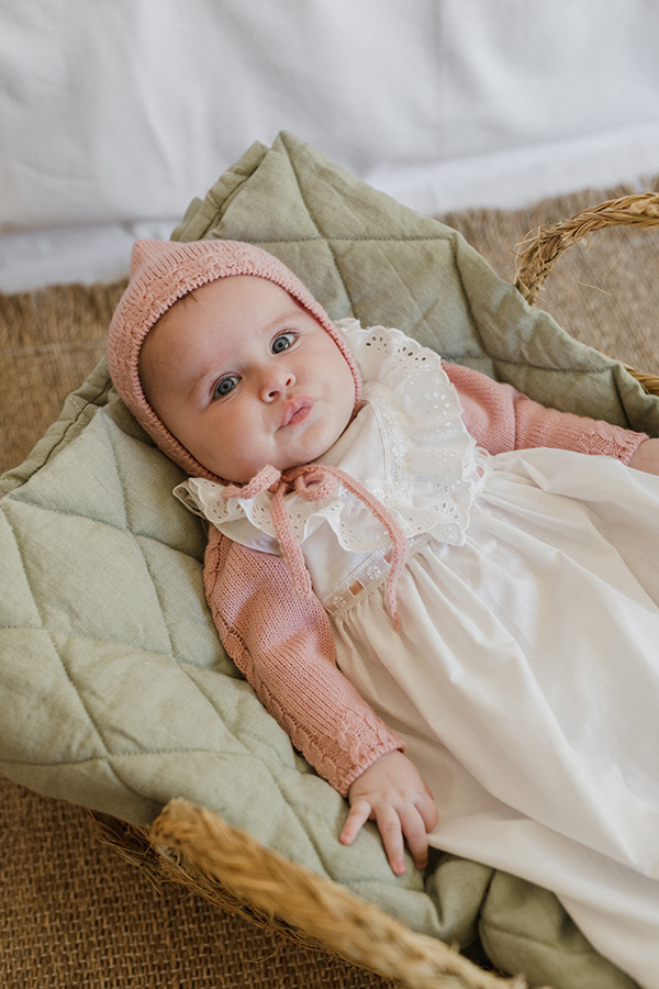 Faldón de batista con tira bordada en forma de pico y lazo en la cintura