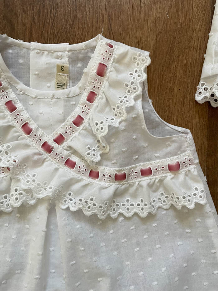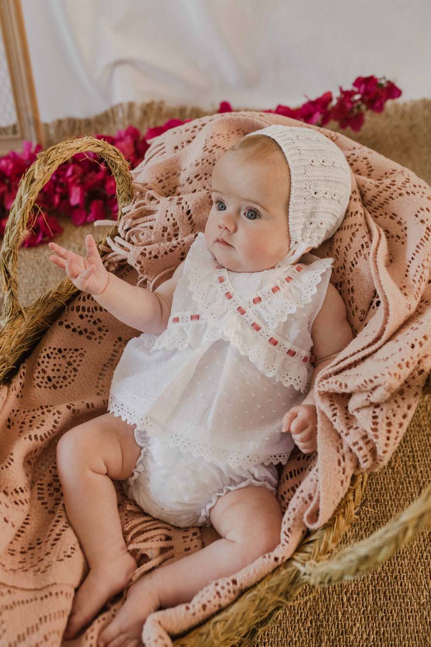 Jesusito de plumeti con tira bordada y lazo de color rosa. Incluye cubrepañal.