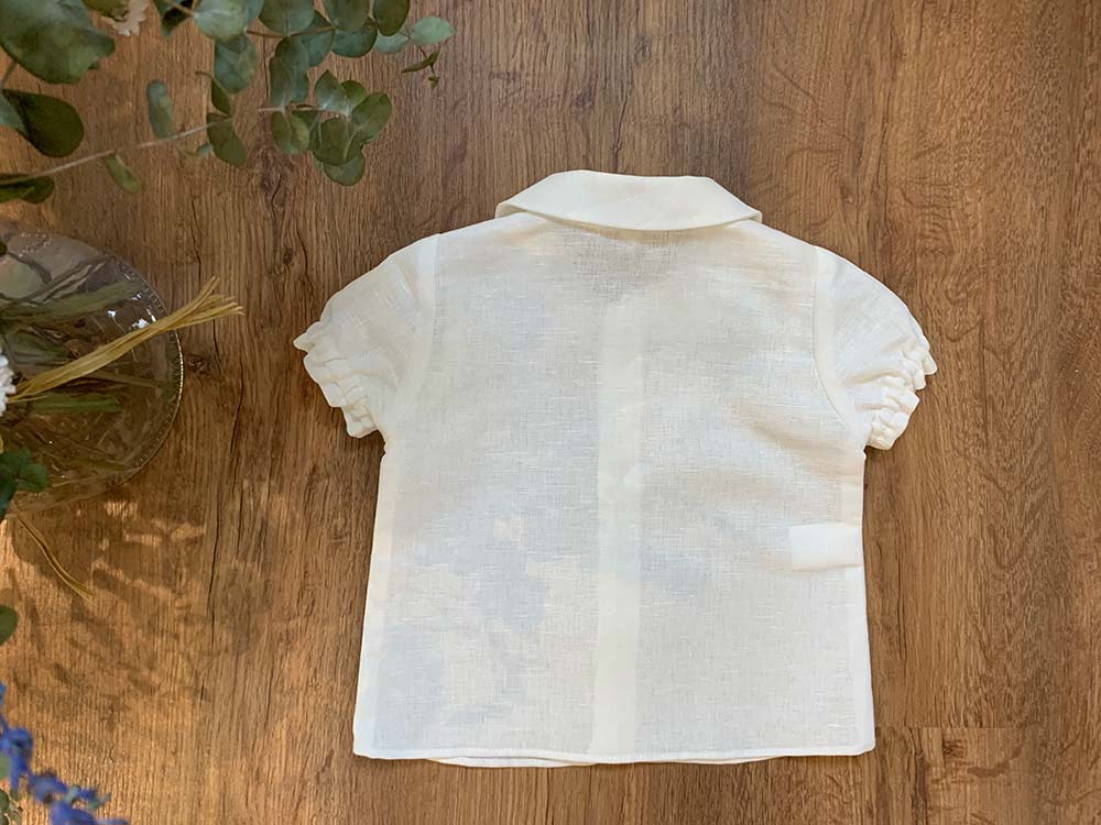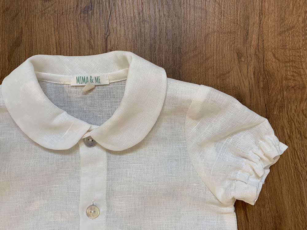 Camisa hecha en lino con cuello bebe y manga corta.– En Mima&Me hacemos ropa para ceremonia por encargo,