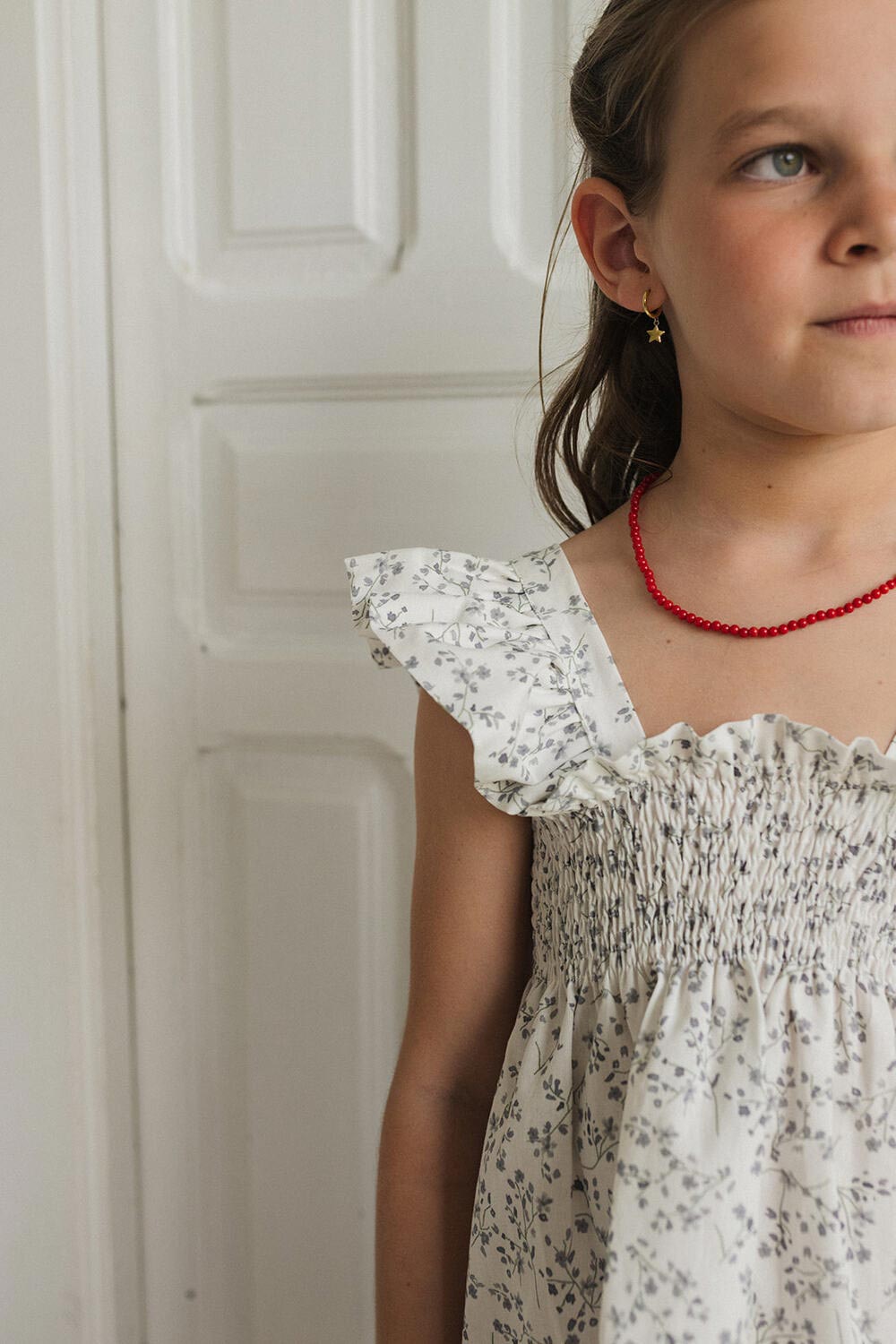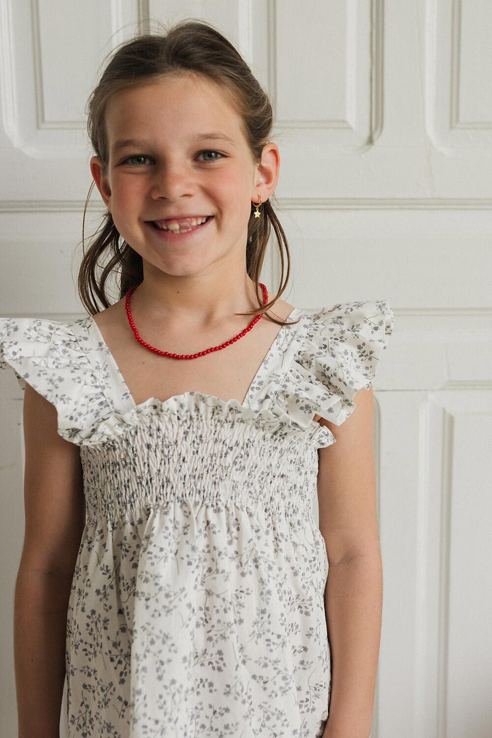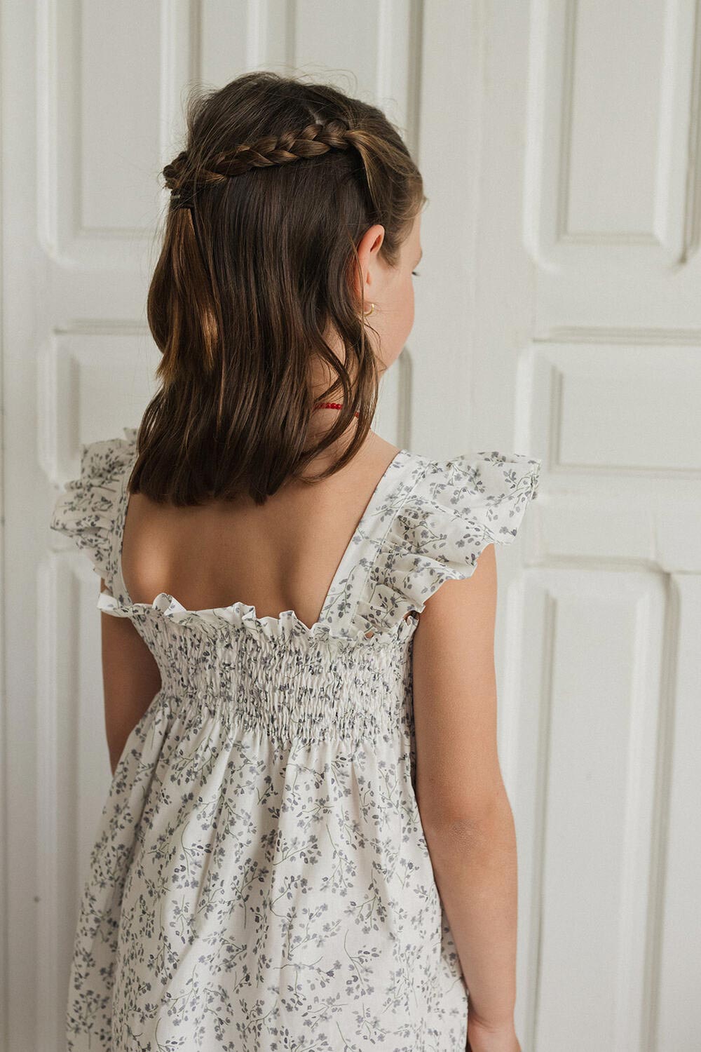 VESTIDO ENGOMADO CON VOLANTE EN EL HOMBRO.