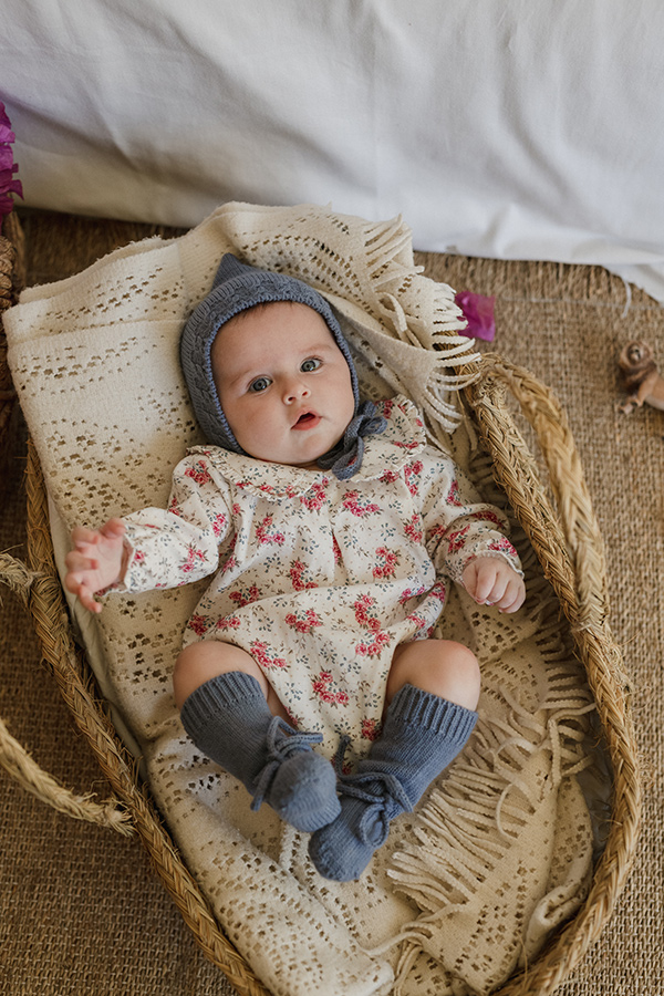 Pelele estampado con flores en tonos rosas y azules con cuello bobo.
