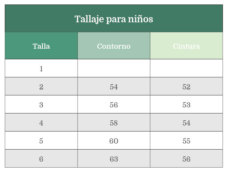 | Talla | 1, 2, 3, 4, 5, 6 |