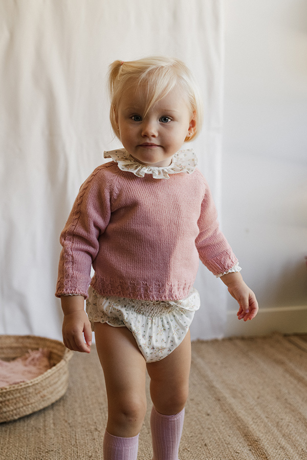 Rebeca/jersey de punto rosa con manga larga, puedes abrocharlo delante o detrás. Si no queda la talla que necesitas, escríbenos para encargarlo.